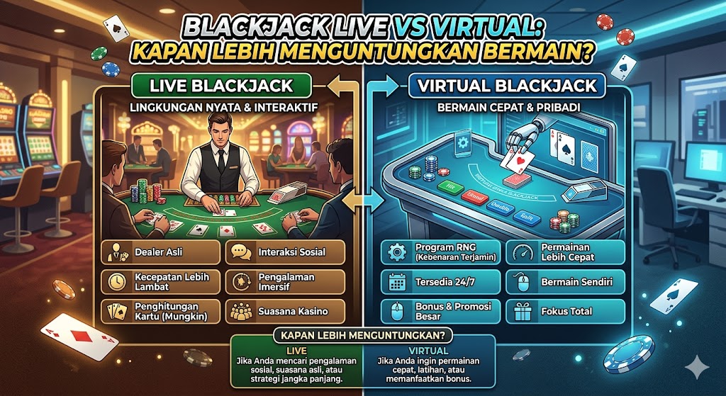Artikel ini membahas perbedaan, kelebihan, dan kapan sebaiknya memilih live atau virtual blackjack.